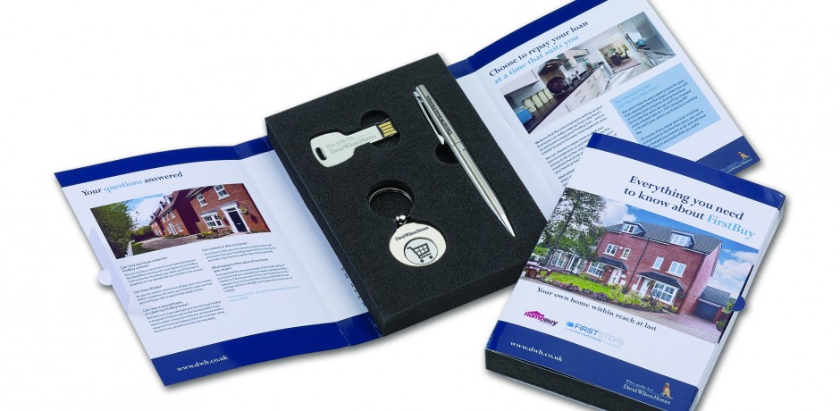 An ingenious presentation pack created from card folded around a foam centre. Very effective and modern in impact…The PEK620 Thank You (shown above) delivers a warm welcoming message with the key to a new home-owner, presented alongside a branded key ring & pen.