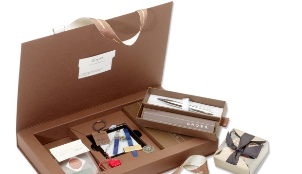 Business card holder cut-out in the lid and inlay designed around gifts & samples