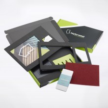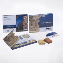 A new product innovation from Knauf, the new Aperture range of Acoustic Wall Board. There is a range of 14 different profiles and this needed communicating to the Architects and Specifiers. Working as a team with the marketing department at Knauf we prototyped, trialled and finally produced a die cut card swatch, bound in the corner, with a page demonstrating each of the profiles in actual size, and then packed the swatch in a fully branded presentation postal box alongside a real sample of the product and the range brochure. These were then distributed to the Architects on request.