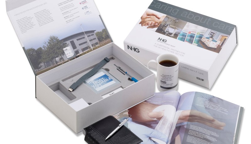 Leaving the client with an overriding impression that NHG will be there when they need them. So that’s how they’ve come to using the Sales Presentation Pack for first appointments, built by BoxcoUK, from a range of promotional items that bed into a foam inlay that really spells care.